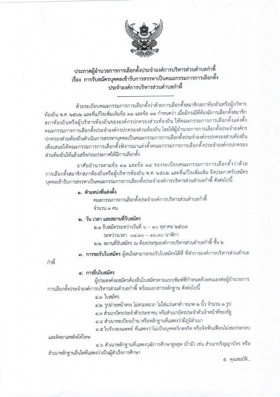 อาศัยอำนาจตามข้อ 31 และข้อ 34 ของระเบียบคณะกรรมการการเลือกตั้งว่าด้วยการเลือกตั้งสมาชิกสภาท้องถิ่นหรือผู้บริหารท้องถิ่น พ.ศ. ๒๕๖๒ และที่แก้ไขเพิ่มเติม จึงประกาศรับสมัครบุคคลเข้ารับการสรรหาเป็นคณะกรรมการการเลือกตั้งประจำองค์การบริหารส่วนตำบลกำพี้
